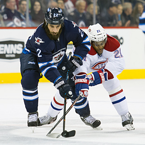 Chris Thorburn tries to fend off Devante Smith-Pelly during an NHL game on March 26, 2015 at the MTS Centre in Winnipeg, Manitoba, Canada. The Winnipeg Jets beat the Montreal Canadiens 5-2 in overtime. (Rusty Barton/HHOF)