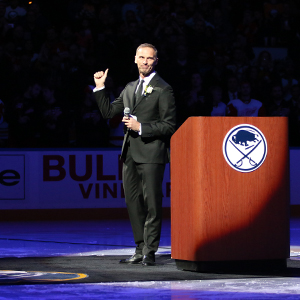 Dominik Hasek is humbled as he gestures to all during his sweater number #39 retirement on January 13, 2015 at the First Niagara Center in Buffalo, New York, USA. (Douglas Johnson/Hockey Hall of Fame)