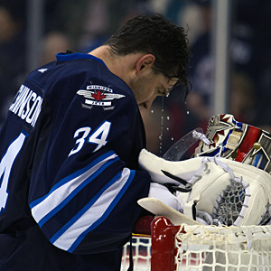 Water drips off the face of Michael Hutchinson during an NHL game on November 18, 2014 at the MTS Centre in Winnipeg, Manitoba, Canada. The Winnipeg Jets beat the New Jersey Devils 3-1. (Rusty Barton/HHOF)