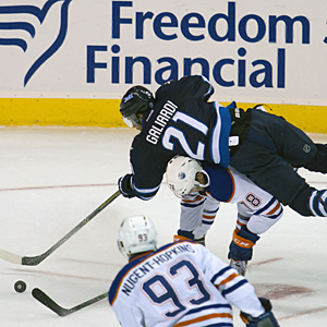 TJ Galiardi is upended but keeps his focus on the puck during an NHL exhibition game on September 24, 2014 at the MTS Centre in Winnipeg, Manitoba, Canada. The Edmonton Oilers edged the Winnipeg Jets 3-2. (Rusty Barton/HHOF)