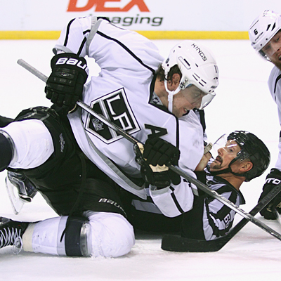 Anze Kopitar #11 of the Kings seems to be enraged with Linesman #66 Darren Gibbs during a game on November 23, 2015 at the BB&T Center in Sunrise, Florida, USA. (Ward Benjamin/HHOF)