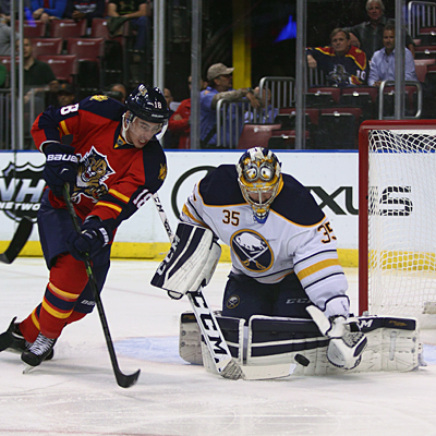 Reilly Smith #18 of the Panthers and goalie Linus Ullmark #35 of the Sabres look for the loose puck during an NHL game on November 12, 2015 at the BB&T Center in Sunrise, Florida, USA. The Sabres beat the Panthers 3 - 2. (Ward Benjamin/HHOF)