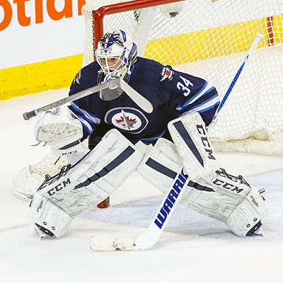Michael Hutchinson #34 of the Winnipeg Jets has to contend with a flying errant stick during an NHL game on February 11, 2016 at the MTS Centre in Winnipeg, Manitoba. The Boston Bruins beat the Winnipeg Jets 6 - 2. (Rusty Barton/HHOF)