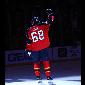 Jaromir Jagr of the Florida Panthers salutes the hometown fans on February 20, 2016. Jagr scored his 741st and 742nd goal to move past Brett Hull into third place on the NHL's all-time list. (Ward Benjamin/HHOF)
