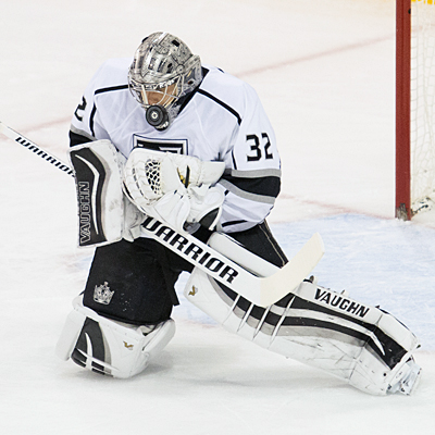 Jonathan Quick #32 of the Los Angeles Kings eyes the puck at close range during an NHL game on October 27, 2015 at the MTS Centre in Winnipeg, Manitoba, Canada. The Los Angeles Kings beat the Winnipeg Jets 4 - 1. (Rusty Barton/HHOF)