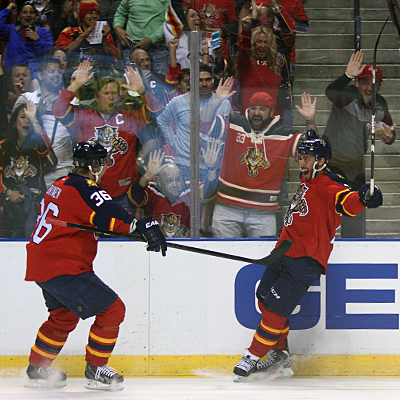 Celebration south Florida style during an NHL game on October 10, 2015 at the BB&T Center in Sunrise, Florida, USA. The Florida Panthers crushed the Philadelphia Flyers 7 - 1. (Ward Benjamin/HHOF)