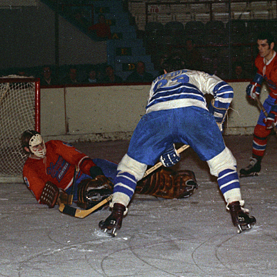 Ken Dryden #1 of the Montreal Voyageurs is down to make a save during an AHL game against the Cleveland Barons at the Cleveland Arena in Cleveland, Ohio. (Marvin Axelrod/HHOF)