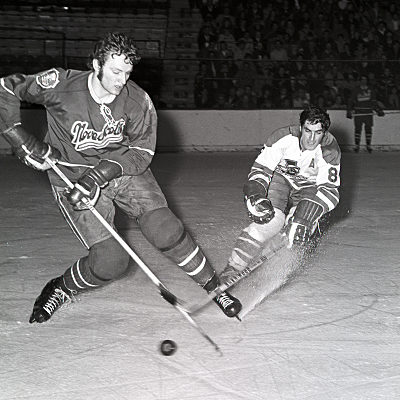 Larry Robinson of the Nova Scotia Voyageurs battles for the puck during an AHL game against the Cleveland Barons at the Cleveland Arena in Cleveland, Ohio. (Marvin Axelrod/HHOF)