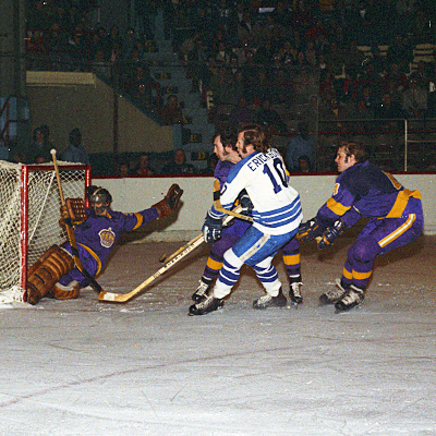 Billy Smith #30 of the Springfield Kings slides to make the save during an AHL game against the Cleveland Barons at the Cleveland Arena in Cleveland, Ohio. (Marvin Axelrod/HHOF)
