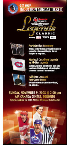 | See the "MontrĂ©al Canadiens Legends" take on the "All-Star Legends" in the Source For Sports® Hockey Hall of Fame Legends Classic that will take place at Air Canada Centre on Sunday, November 9, 2008 at 2:00 PM